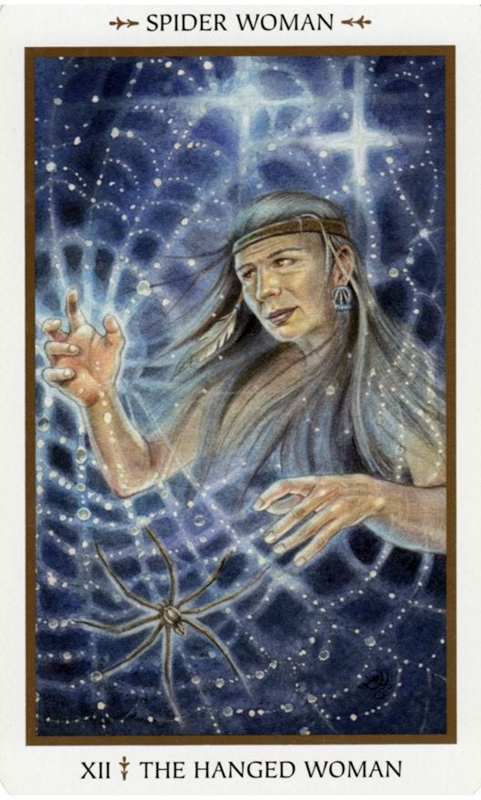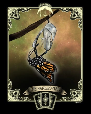 The image of the tarot’s Hanged One has come to mind several times over the past week. Like the caterpillar in the chrysalis, this figure also hangs upside down, experiencing his own holy alignment with a higher vibration of himself.